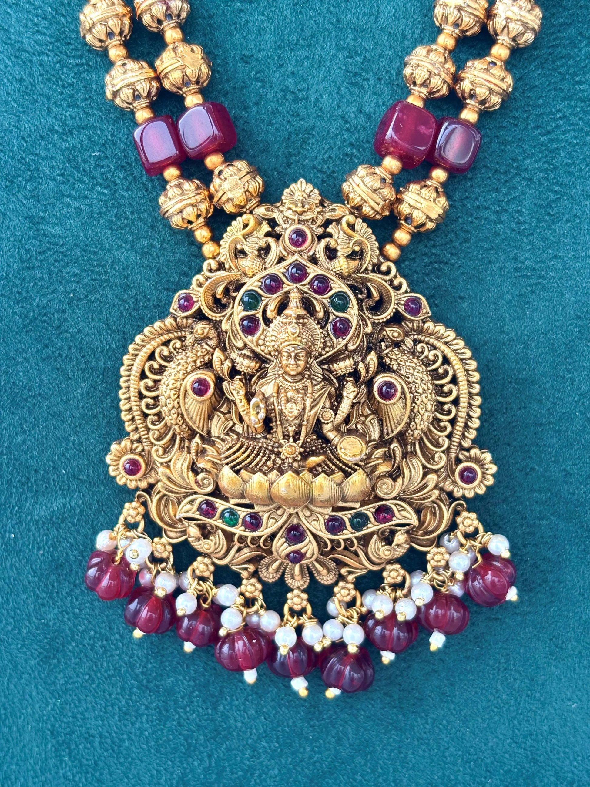 Elevate your ethnic style with this handcrafted Lakshmi temple necklace, featuring an intricate antique gold finish and red hydro bead accents. With matching jhumkas. Length 11.5 inches from hook to pendant with adjustable chord.