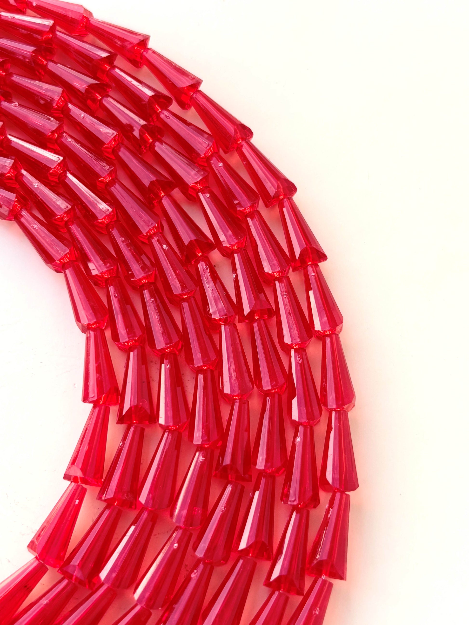 Discover red tower-shaped crystal acrylic beads, perfect for adding a unique vertical accent to your jewelry and craft projects. Size 15x6MM. Sold by single strand measuring 15 inches with 25 beads approximately.