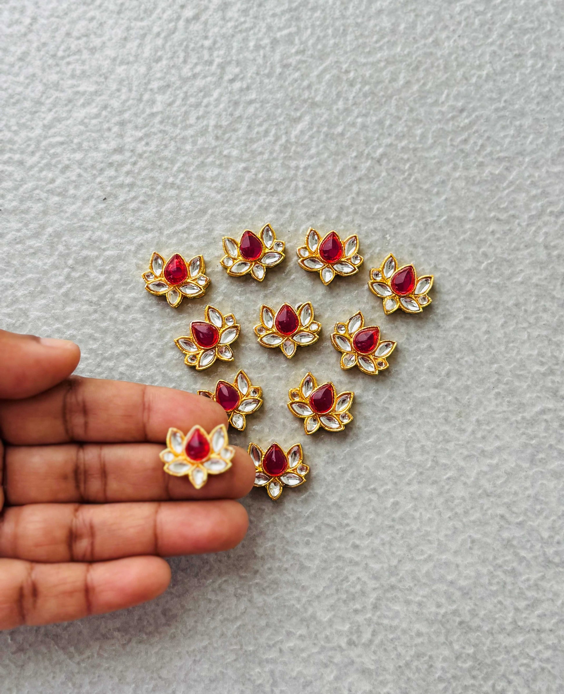 Traditional lotus-shaped Kundan connectors featuring a faceted rose center stone surrounded by white polki petals. Sold as a single piece.
