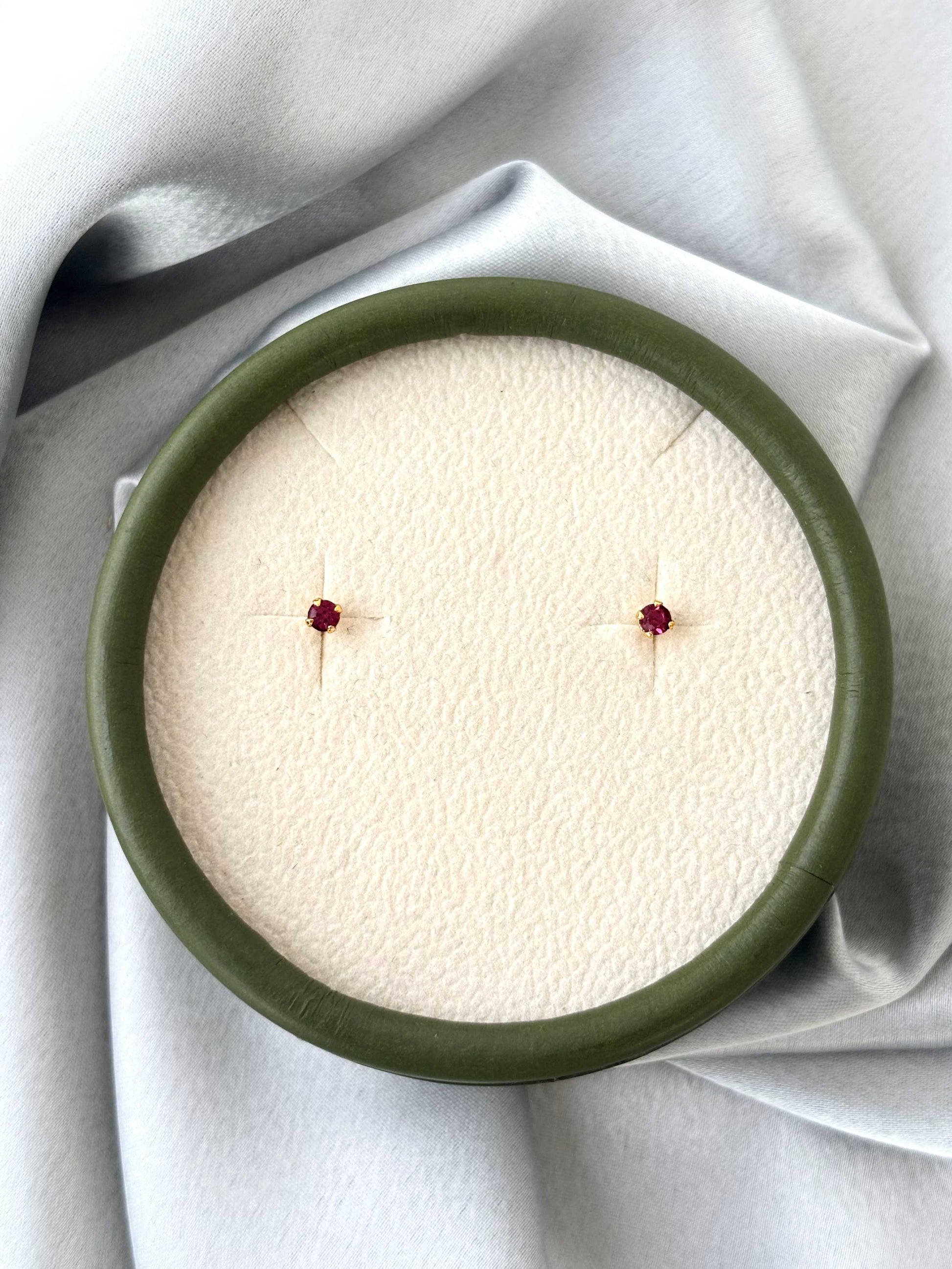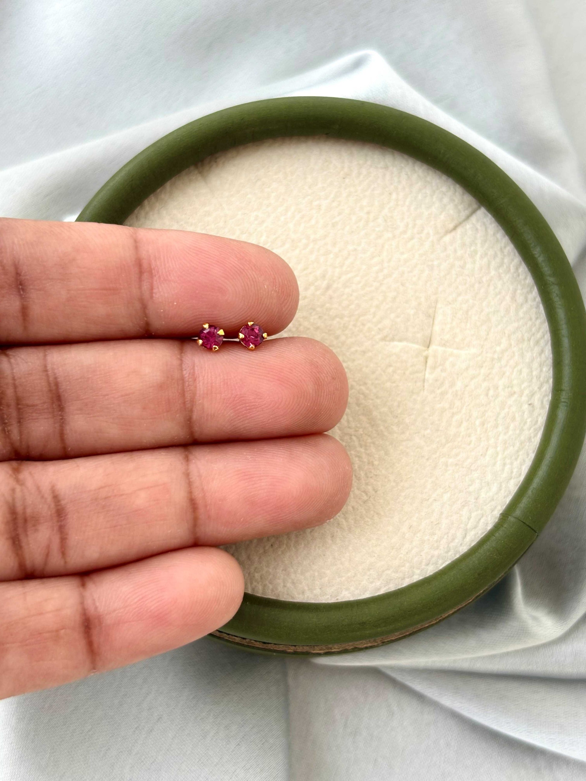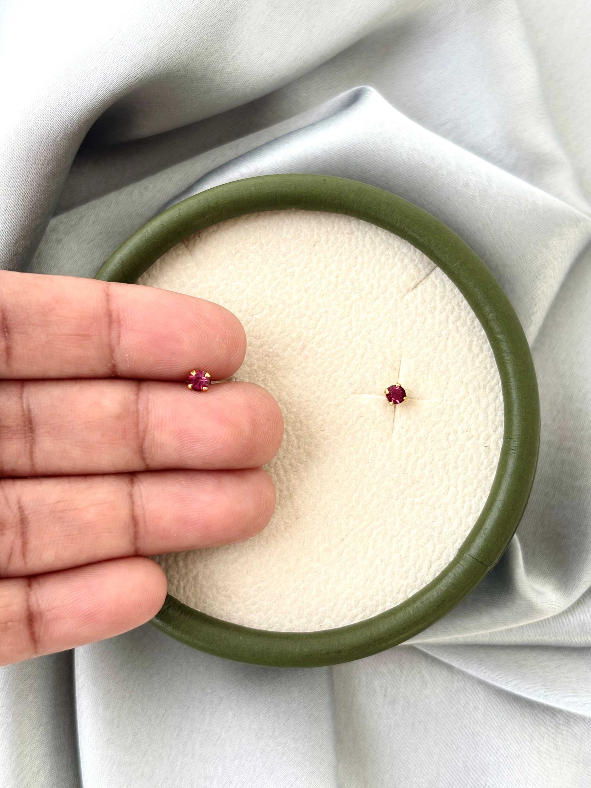 Gold-plated solitaire studs featuring a vibrant magenta-pink stone. Crafted with skin friendly materials for a comfortable and classic daily glow. Can be used as a nose pin or second studs.