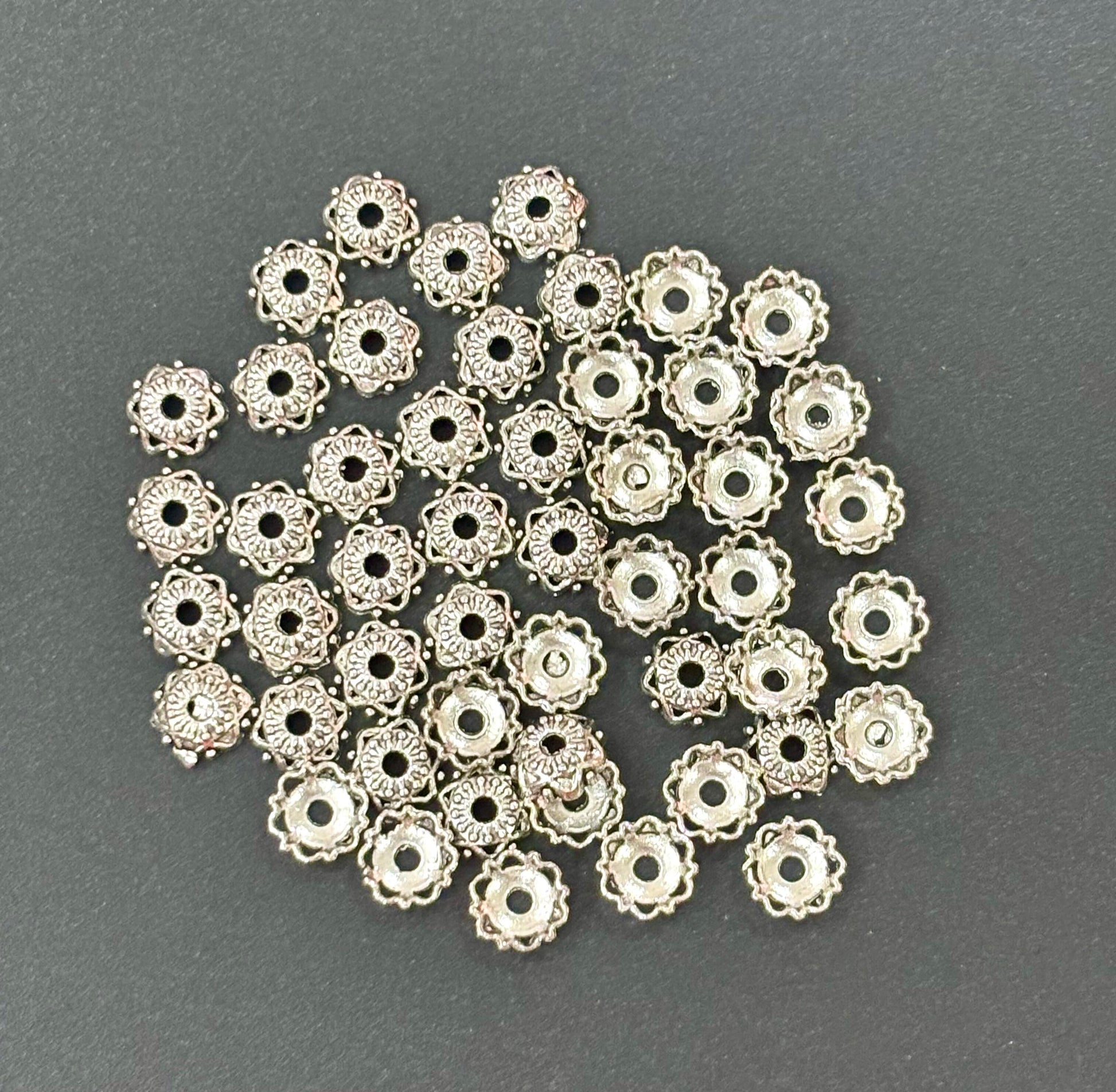 Enhance your beaded jewelry with these charming scalloped flower bead caps. Size 7mm. Pack of 50 pieces.