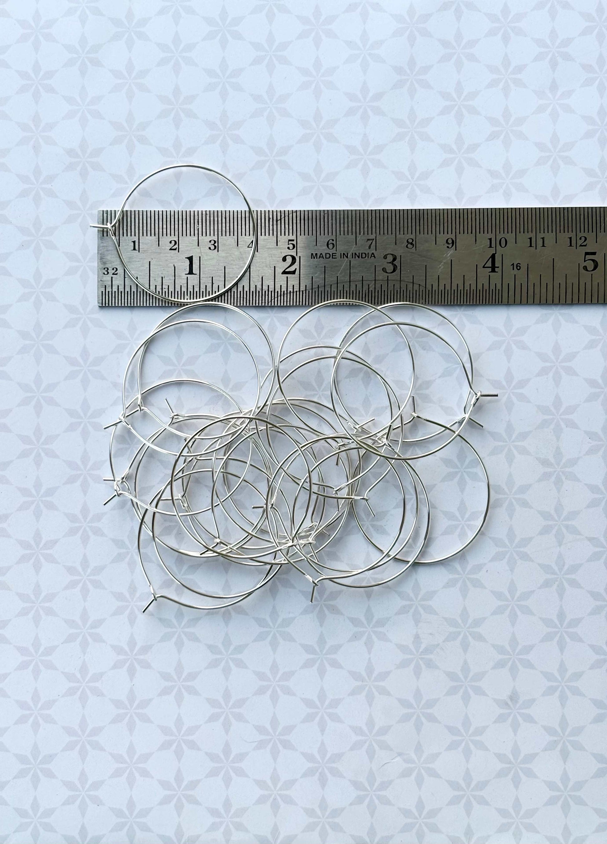 High-quality silver-tone round wire hoops with a secure latch closure, ideal for DIY beading and custom earring designs. Pack of 20 pairs of hoops. Size 35MM.