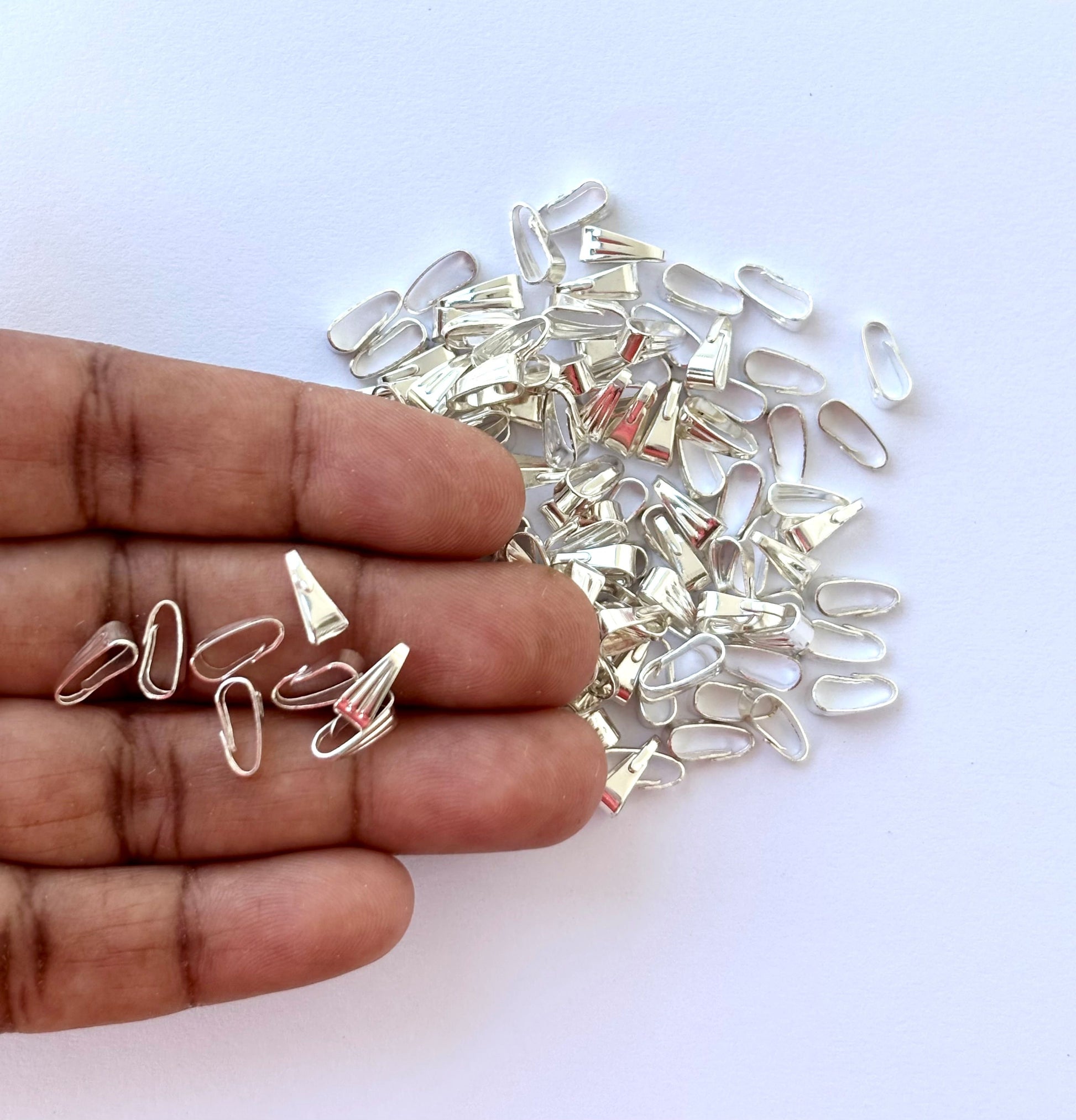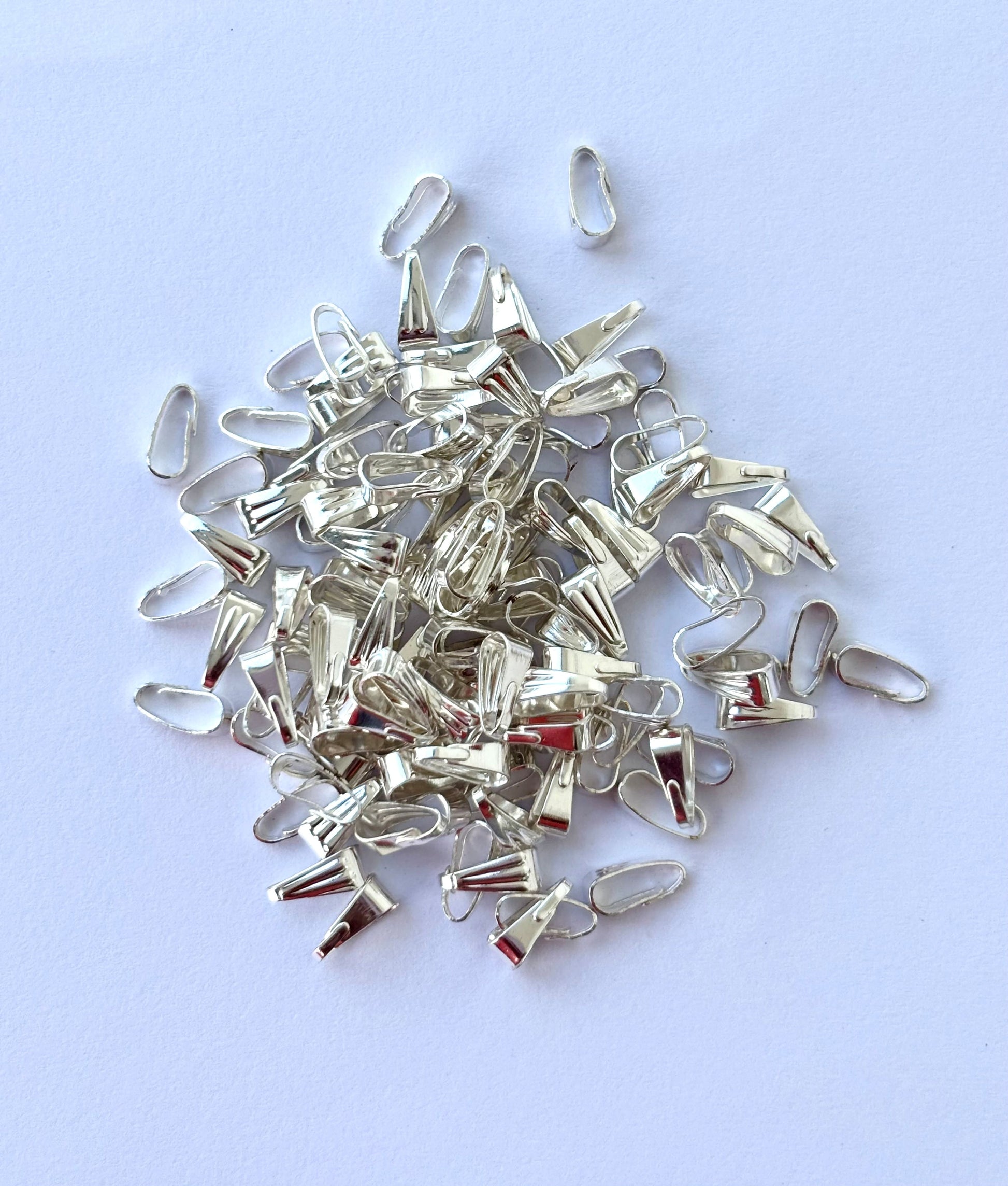 Give your necklaces a sleek, professional look by easily attaching pendants and charms with these classic silver-polished pinch bails. Pack of 100 pieces. Size 3x8mm.