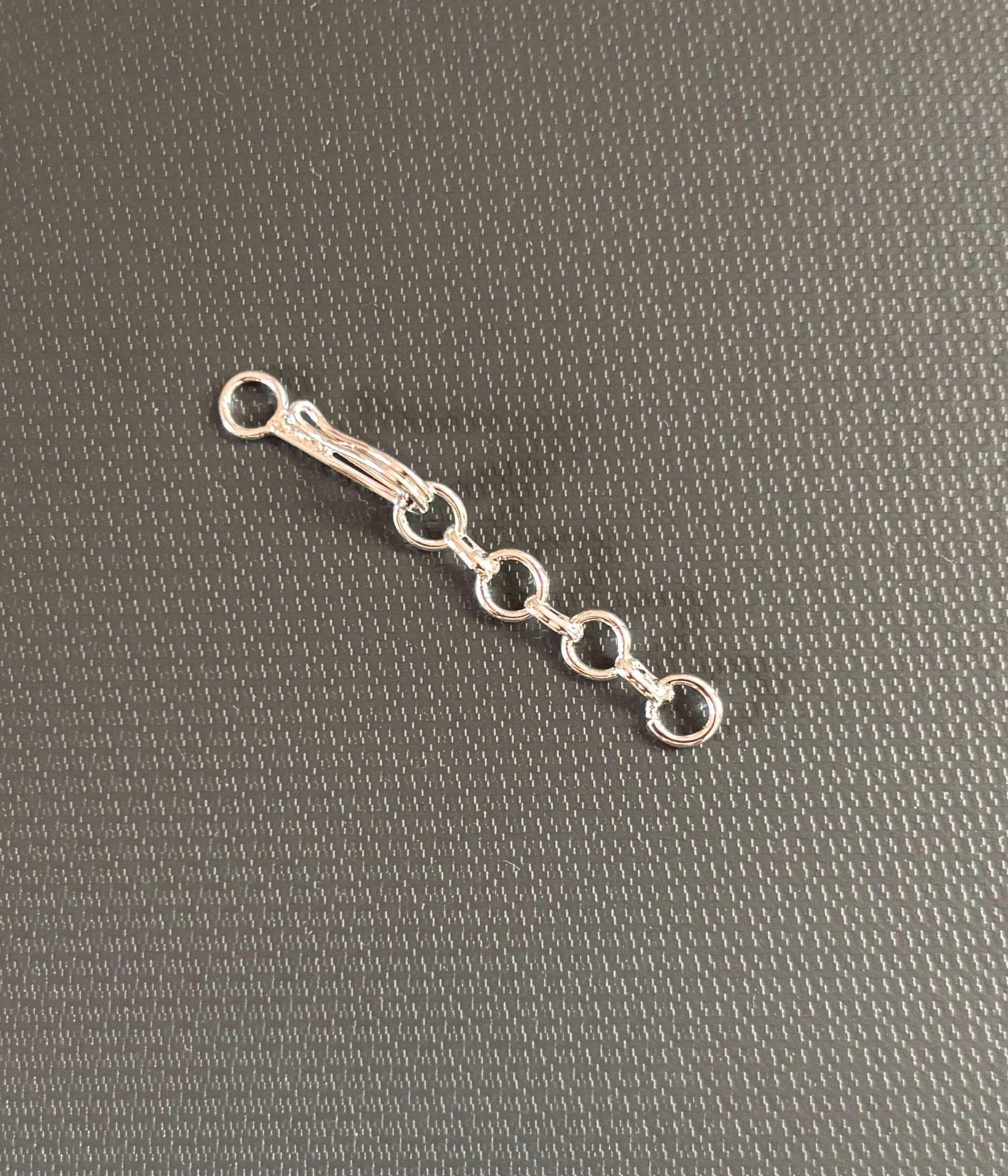 A short, sturdy silver-tone chain segment with a connector loop, perfect for small length adjustments on bracelets and necklaces. Electro plated coating. Soldering done to remove sharp edges. Pack of 10 pieces. Length 1.75 inches.