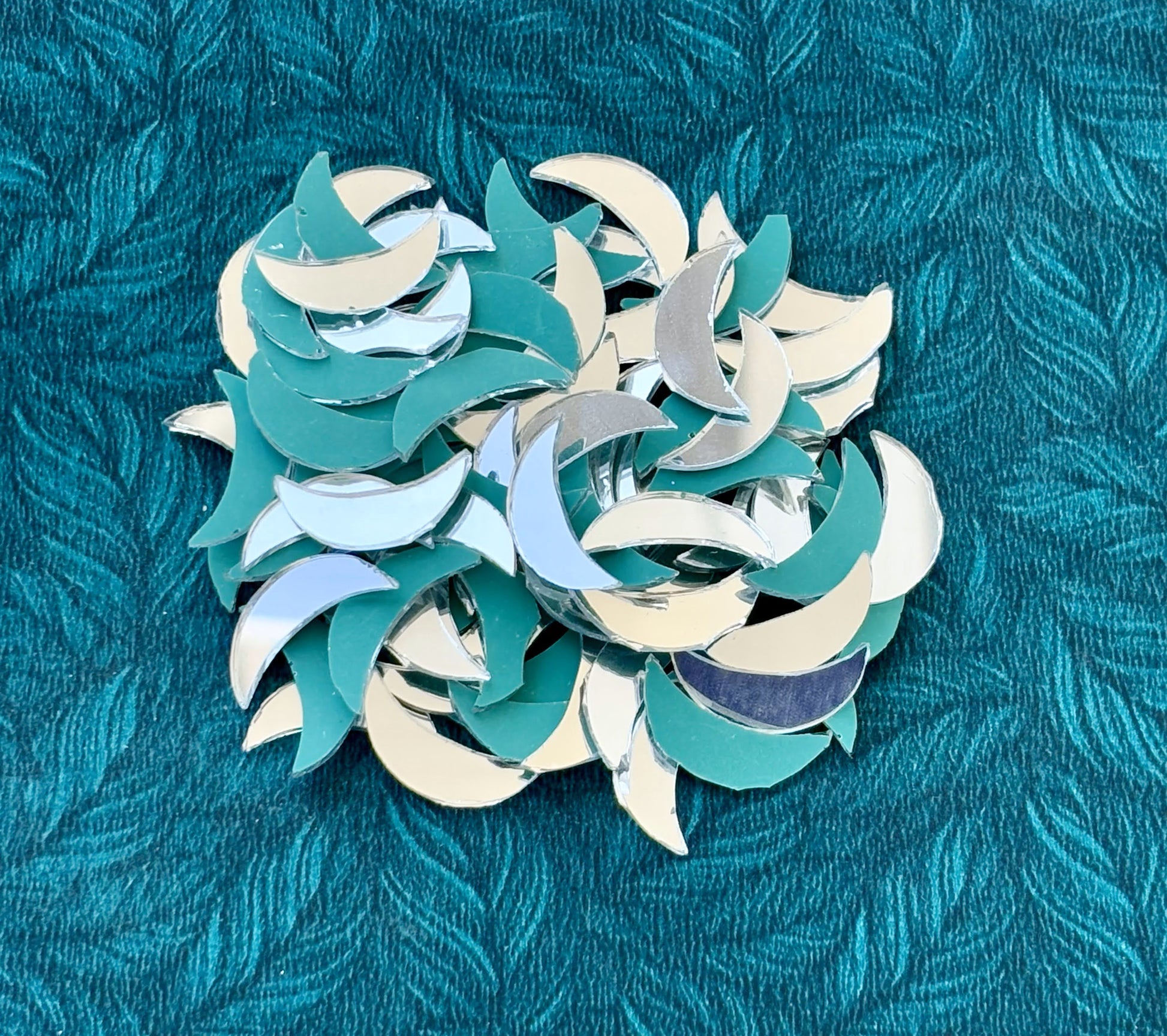 Silver Fancy Shape - Crescent Moon Cut Mirrors - Unique Decorative Mirror Pieces for Crafts, Lippan Art, Mandala Art, Art Projects, and Home Décor Accents. The pack has approximately 85 pieces.