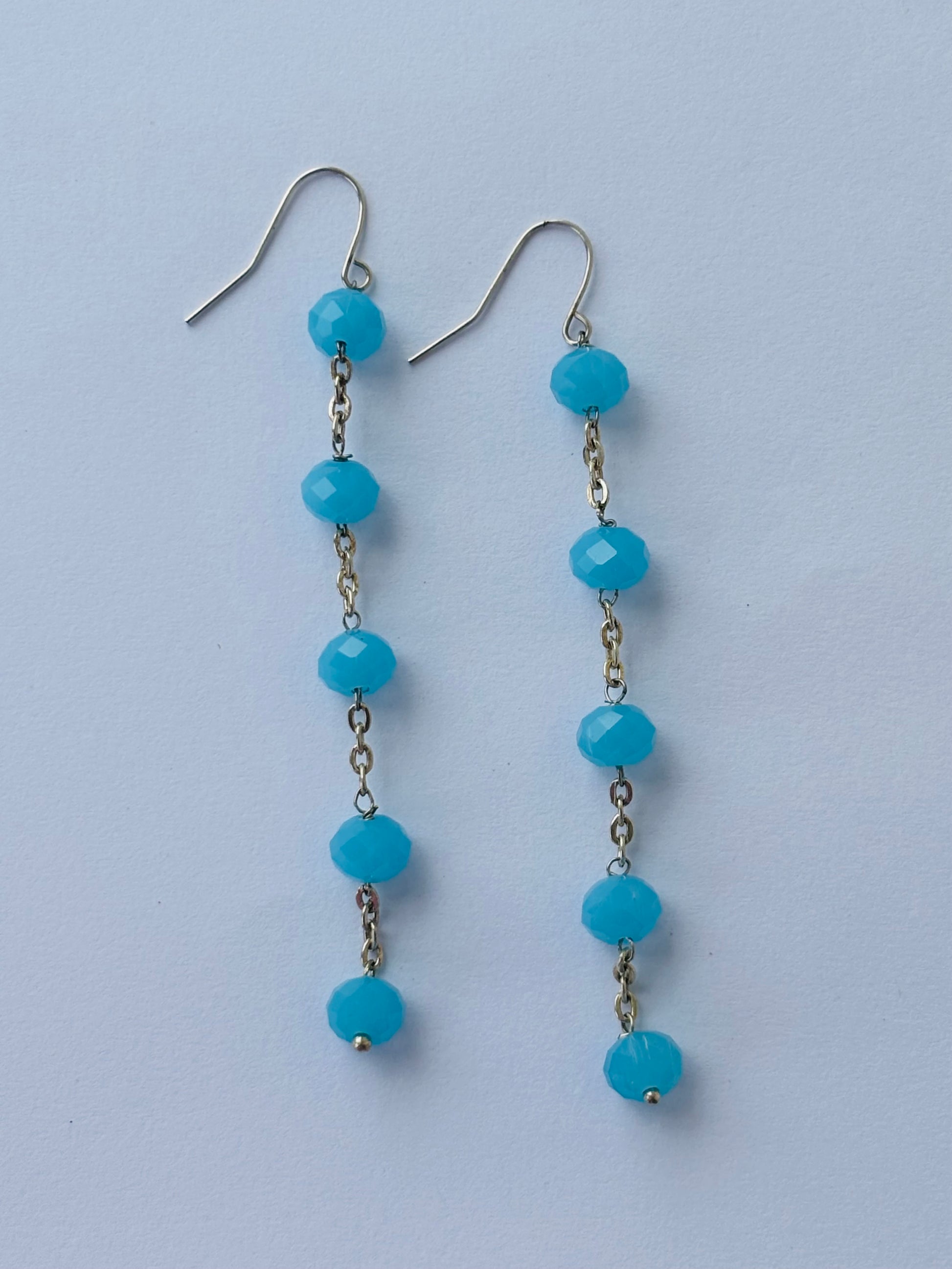 These vibrant handmade dangle earrings feature faceted sky blue crystals linked by a delicate silver-toned chain, adding a pop of color to any outfit. Sold as a single pair.