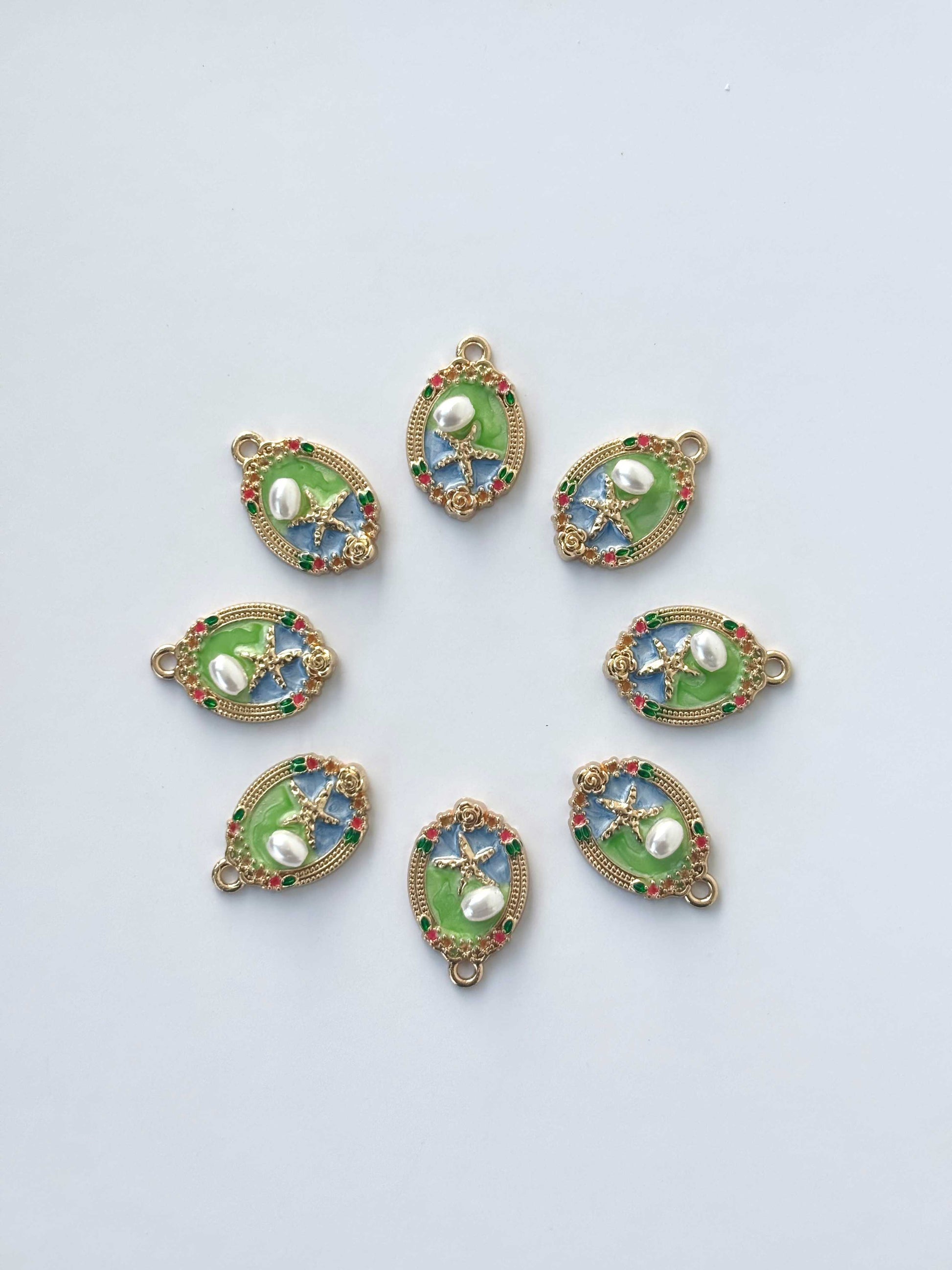 Oval charms with split blue and green enamel, featuring a gold starfish, white pearl, and a festive floral-accented gold border. Pack of single charm.