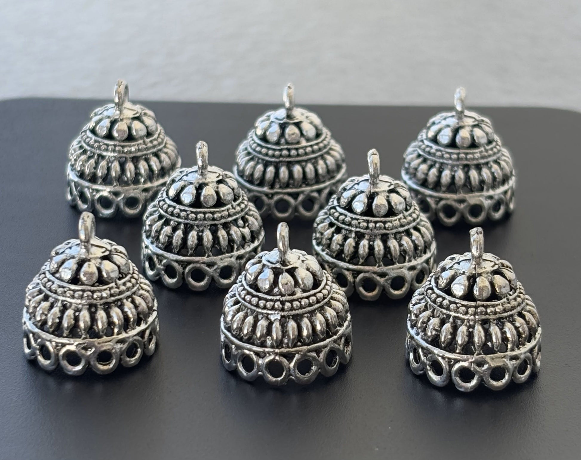 Enhance your DIY jewelry with these floral dome-shaped oxidized silver jhumka bases. Pack of eight pieces.