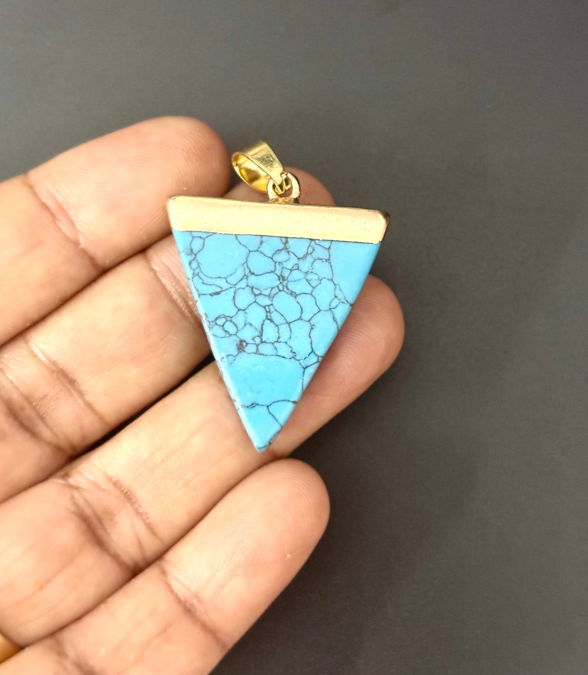 This vibrant turquoise triangle pendant, featuring its distinctive black matrix veining and a sleek gold-tone edge, is perfect for adding a bohemian touch or protective energy to your necklaces and jewelry designs. Sold as a single piece.