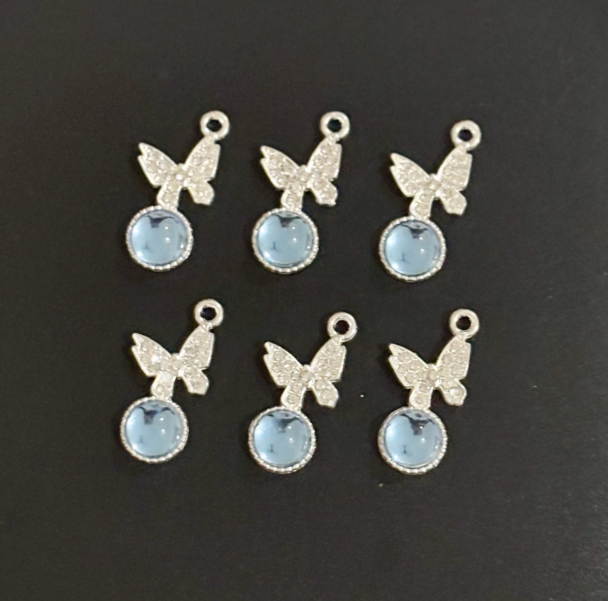 Glittering silver butterfly dangles with shiny rhinestone wings and a bright blue crystal teardrop. Ideal for earring, bracelet, necklace, and keychain designs. Pack of two charms.