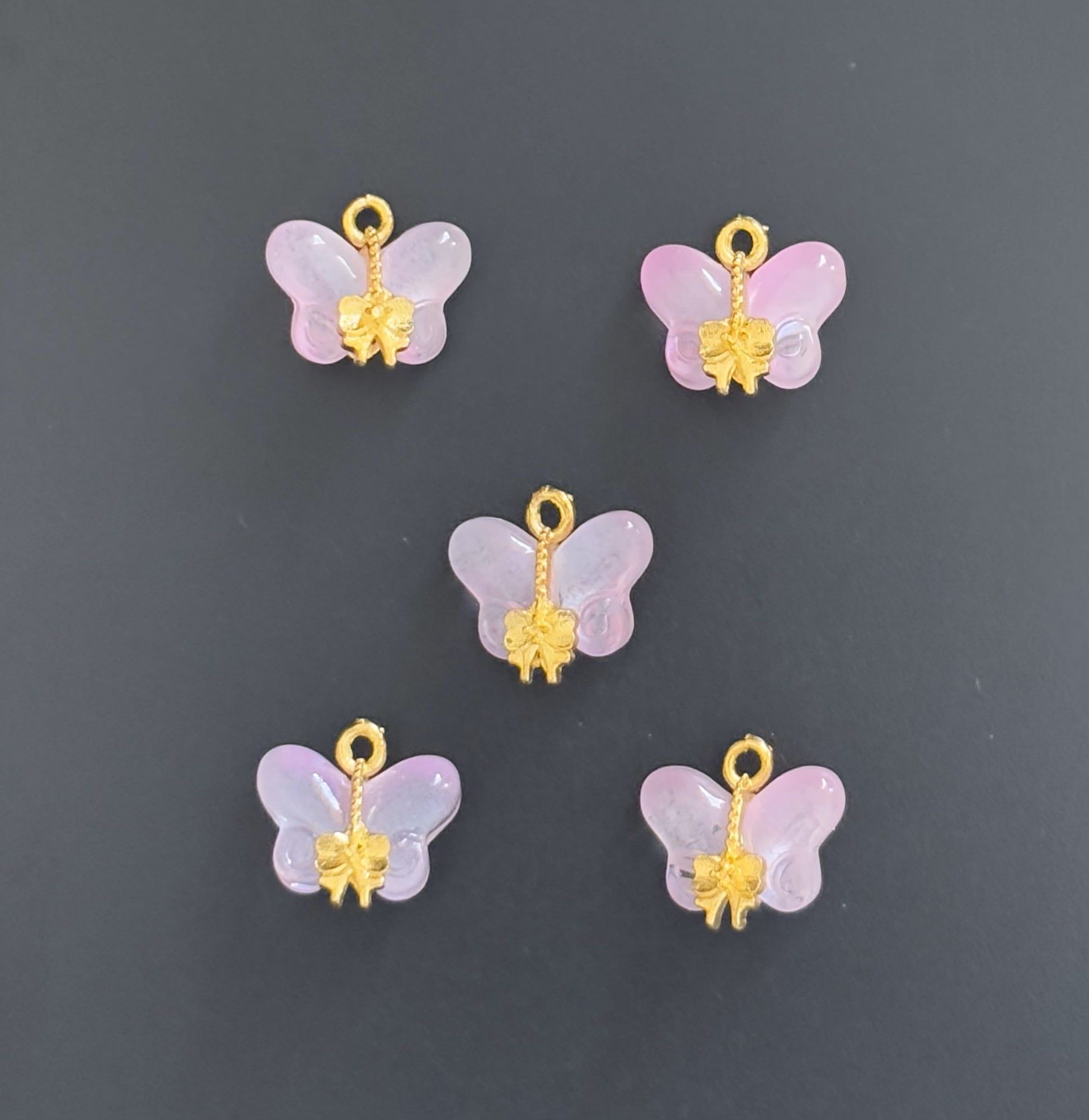 Two Pieces Iridescent Pink Butterfly Charms with Gold Trim