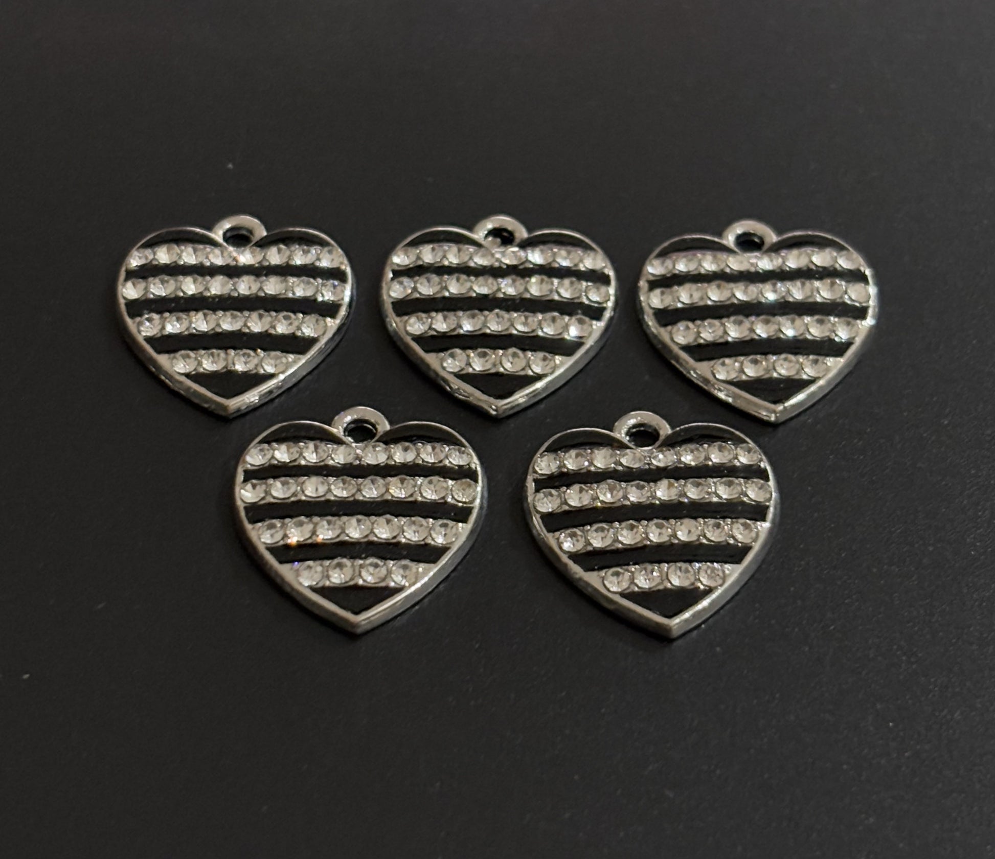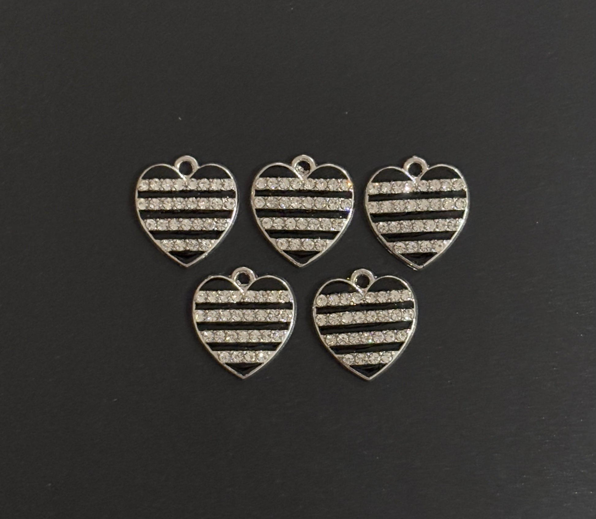 Glitter with sophistication with these striped rhinestone heart charms. With alternating stripes of clear crystals and streamlined silver lines, these fashionable pendants are ideal for DIY necklaces, earrings, bracelets, and fashion jewelry. Pack of two charms.