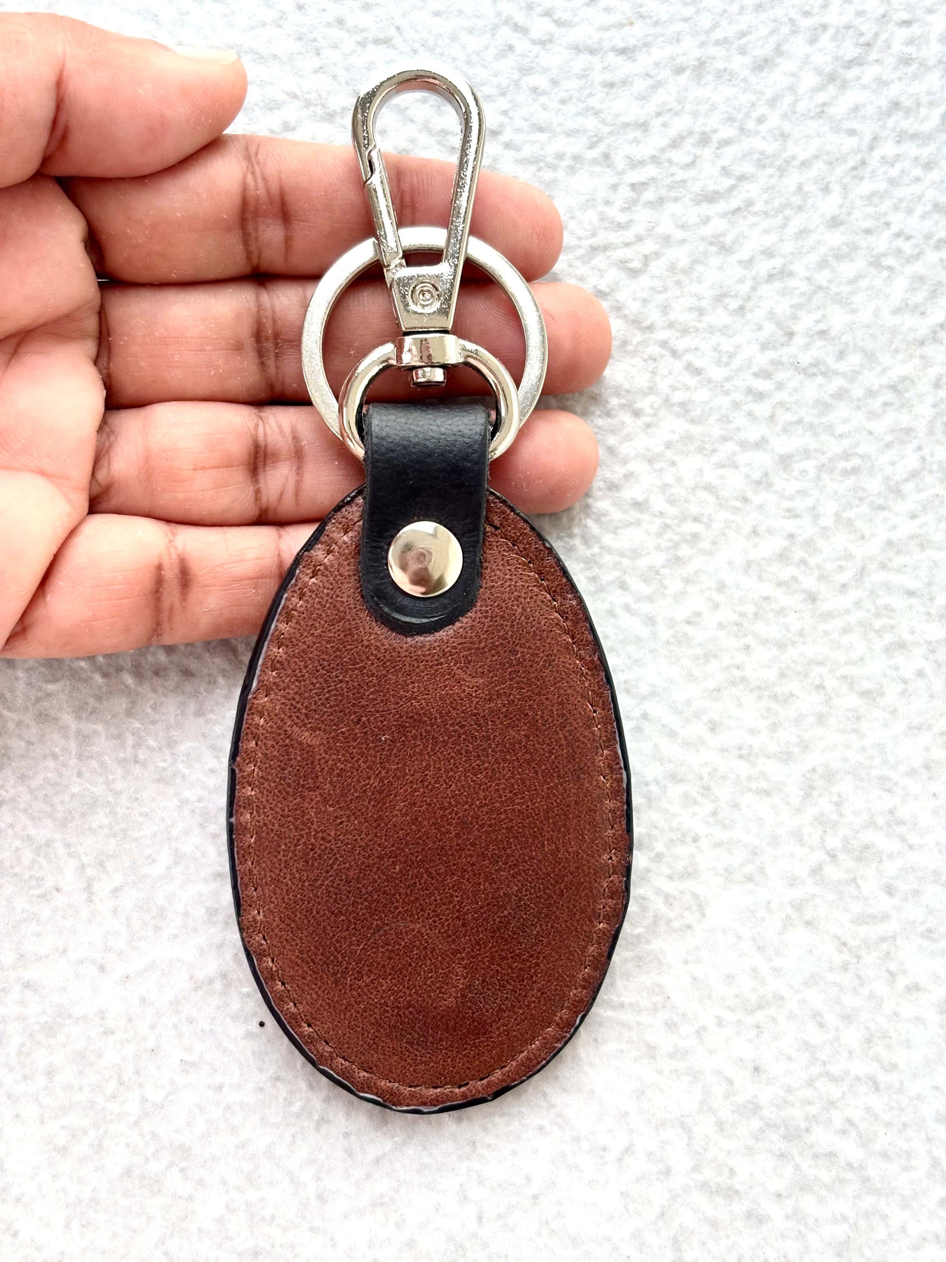 A stylish oval keychain crafted from two-tone brown and black leather, featuring both a key ring and a secure metal clasp. Sold as a single piece.