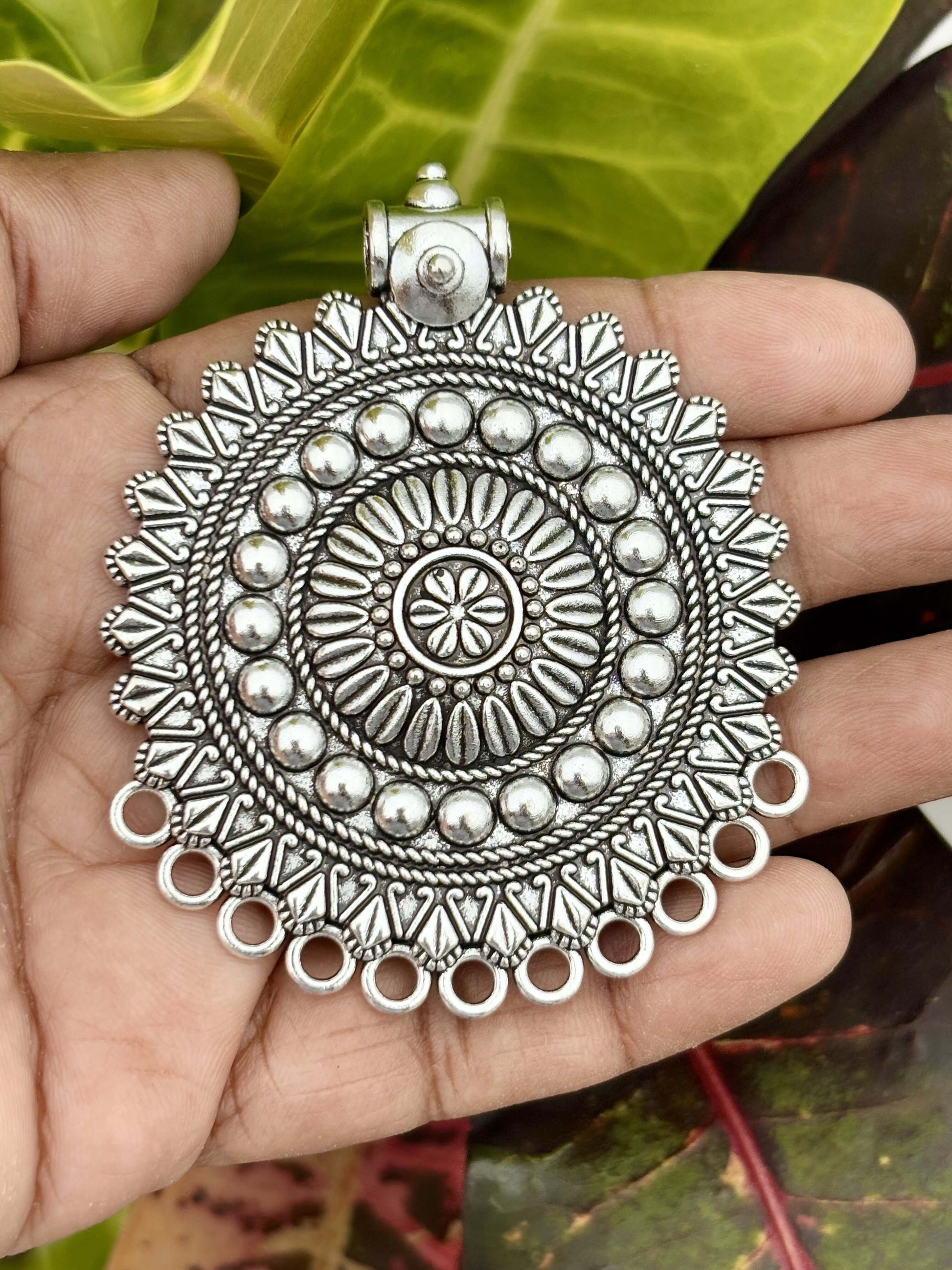 Take your boho or ethnic style to the next level with this gorgeous vintage sunburst tribal pendant in oxidized silver. Sold as a single piece.