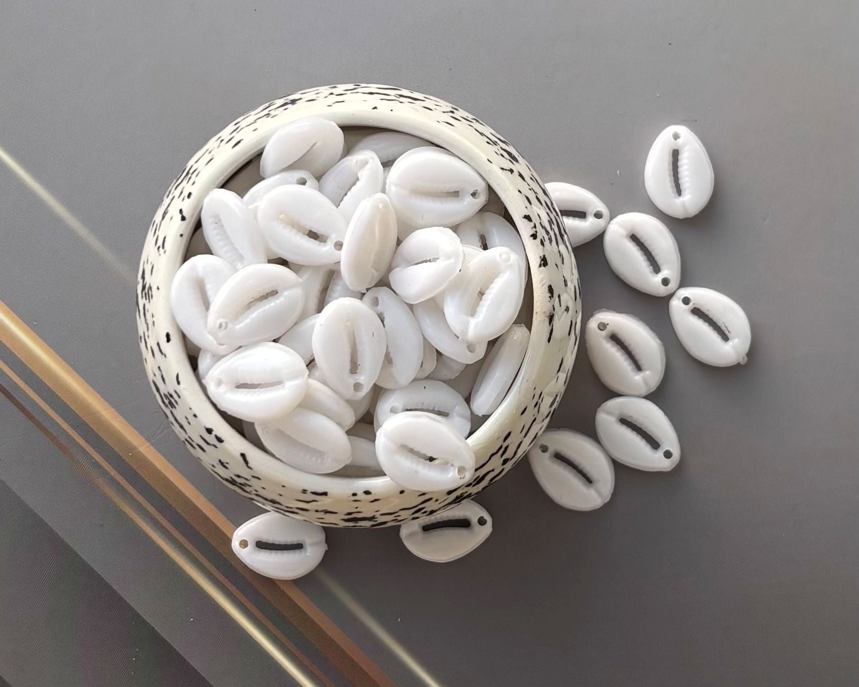 These charming white cowrie shell shaped beads are perfect for adding a bohemian, beachy, or natural touch to your jewelry designs, hair accessories, and craft projects. Pack of 145 beads approximately. Size 15x10MM.
