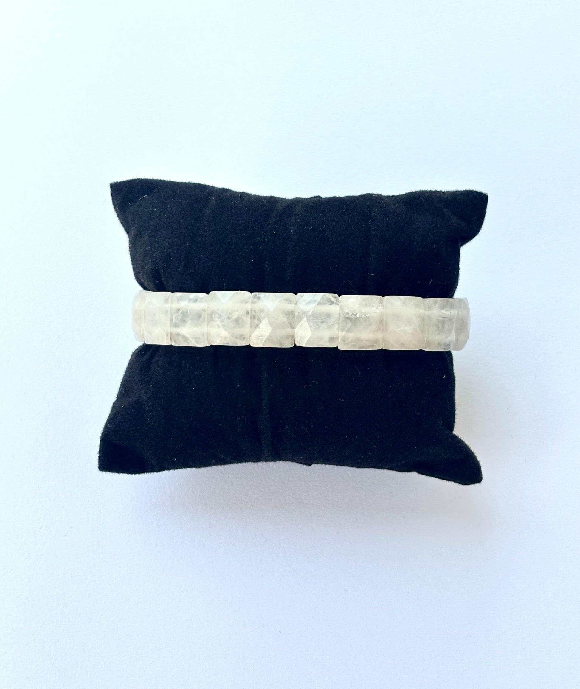 Amplify your style with this luminous bracelet featuring large, faceted rectangular beads of natural White Crystal Quartz. Sold as a single piece. Free Size. Bracelet made with strong elastic.